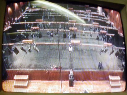 その頭上、部屋の角にはモニターが。