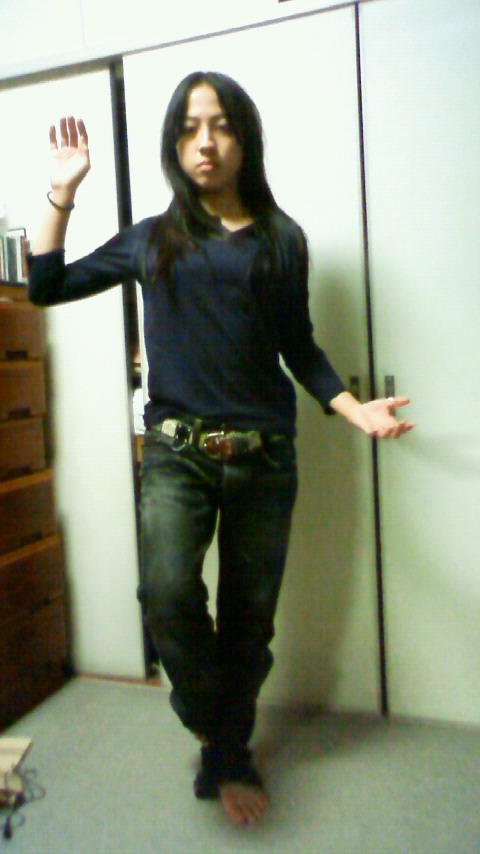最終的には左足のみで立っている状態。この時左手はへそ位の高さ、右手は肩位の高さにキープ。丁度お釈迦様のような形。
